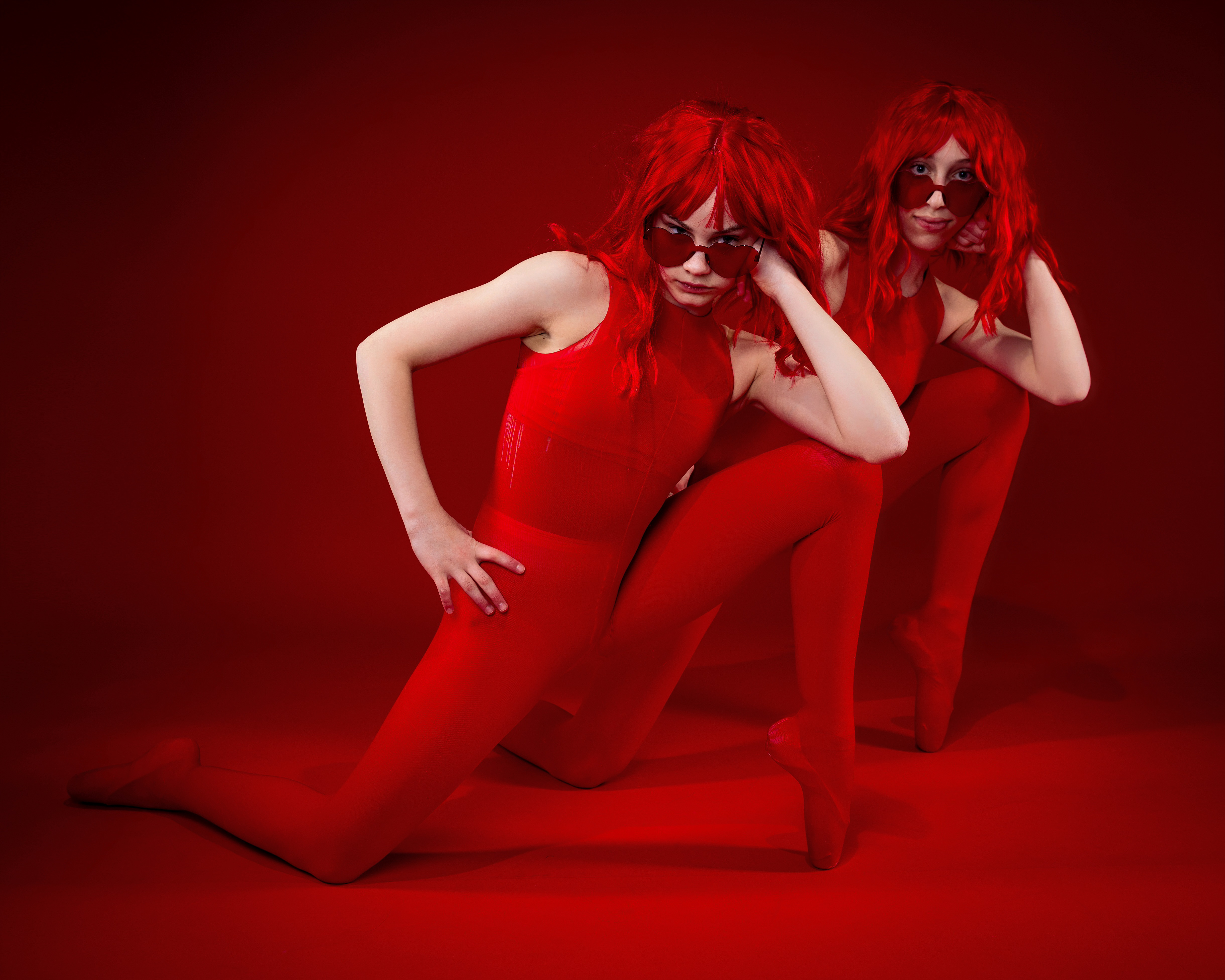 Two dancers in red bodysuits and red wigs posing artistically against a bold red backdrop for a fine art dance portrait session.