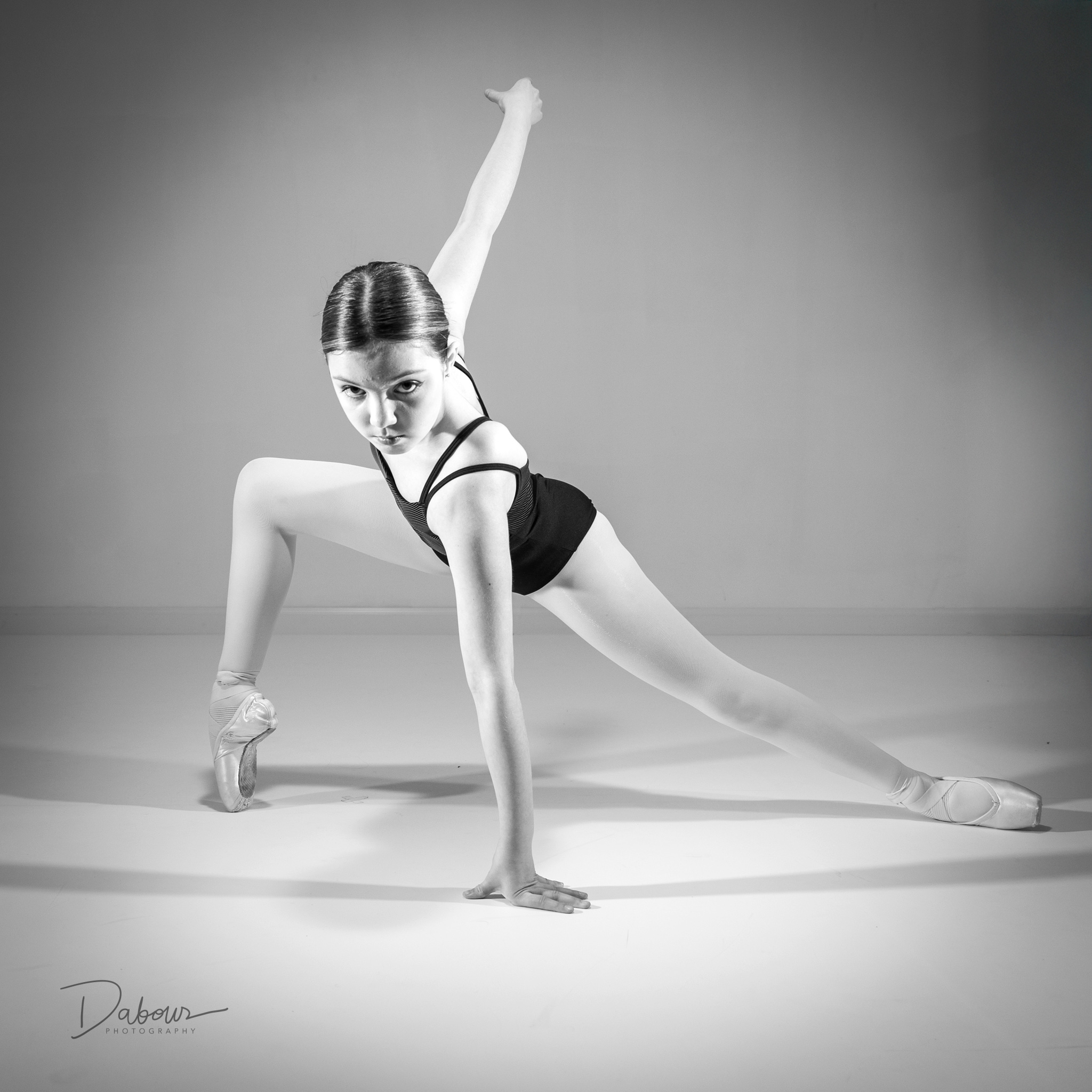 Vivi Taggart, dance ambassador for Dabour Photography, posing in a black leotard and pointe shoes for a fine art dance portrait.