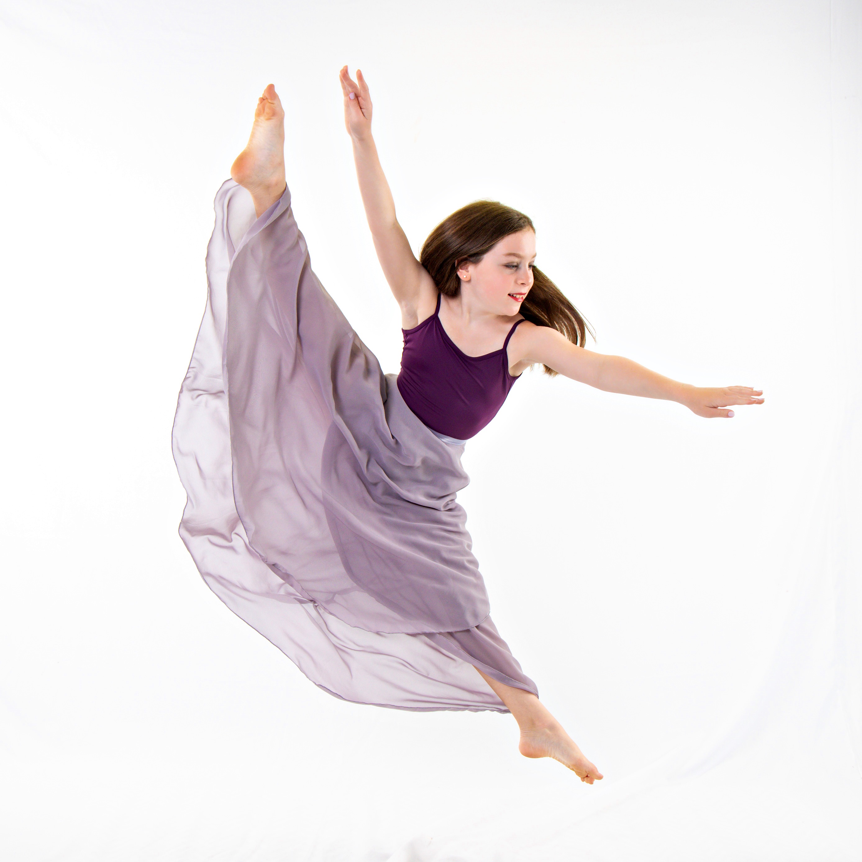 Young ballerina Olivia Klein wearing a purple leotard and a long, flowing sheer white skirt, performing a dynamic dance pose in a studio.