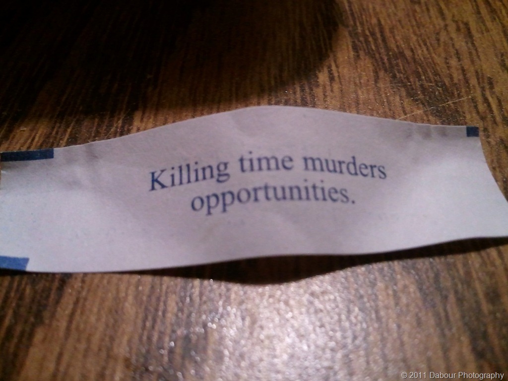 Fortune Killer Posted on October 19, 2011 by dabourphoto I don’t have Chinese food all that often. I thought this fortune rang very true! 294/365 Share this: Click to share on X (Opens in new window) X Click to share on Facebook (Opens in new window) Facebook Click to share on Pinterest (Opens in new window) Pinterest Click to email a link to a friend (Opens in new window) Email Click to print (Opens in new window) Print Like Loading... Related