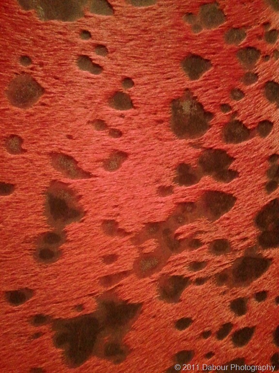 Red Elevator Skin Posted on November 21, 2011 by dabourphoto ON my recent photo workshop the hotel I was staying at had very interesting wall decorations on the inside of their elevators. It was an animal skin perhaps dyed. Not sure which one it was but it looks like it has spots! Share this: Click to share on X (Opens in new window) X Click to share on Facebook (Opens in new window) Facebook Click to share on Pinterest (Opens in new window) Pinterest Click to email a link to a friend (Opens in new window) Email Click to print (Opens in new window) Print Like Loading... Related