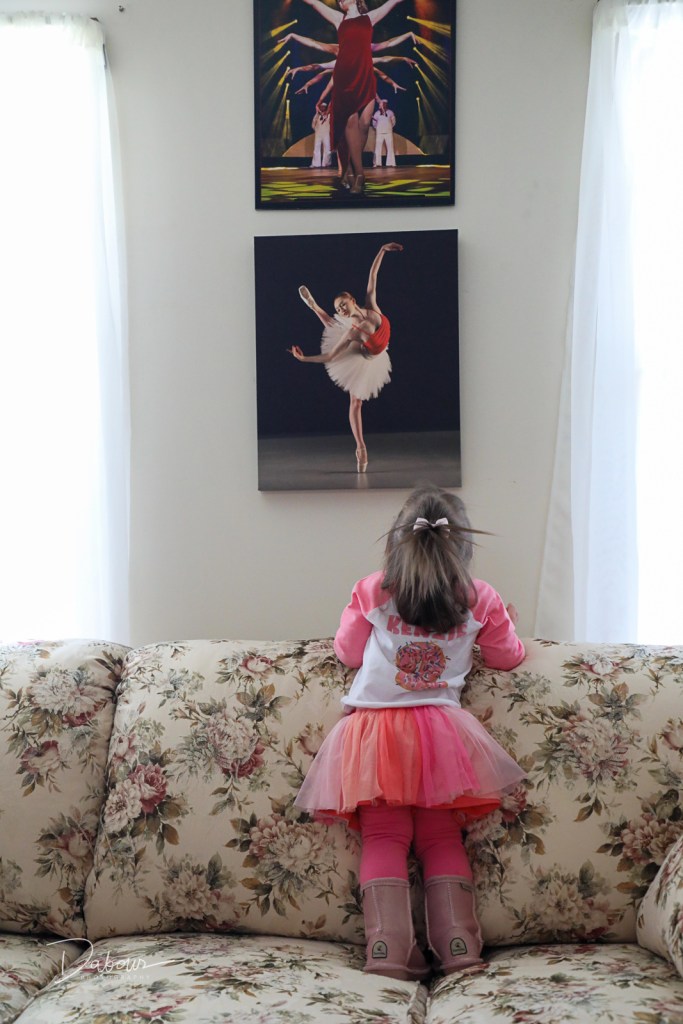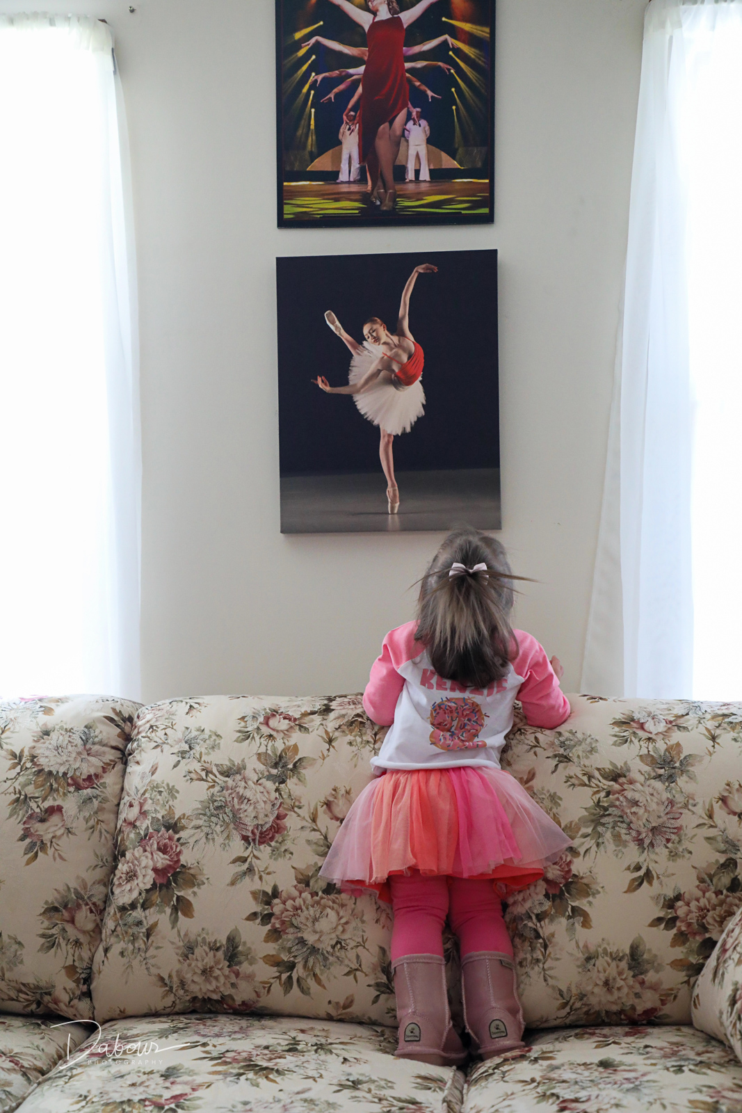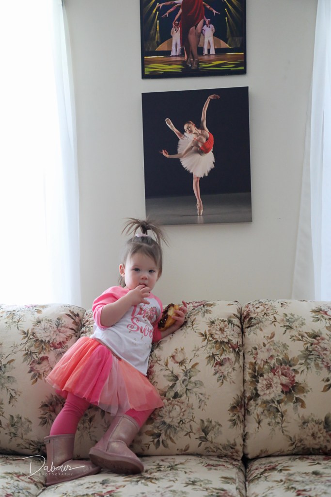 I used to have these couches in my studio (no longer there). Since Mackenzie had a tutu on, I thought it would be cute to create a photo of her looking up at the dancers on the wall. Mom quickly put her on the couch for the first photo. What I didn’t realize at the time, she had a donut in her hand the entire time! This is NOT the reason why I don’t have the couch there anymore!! The couch was fine (never seen a neater 2 year old!)