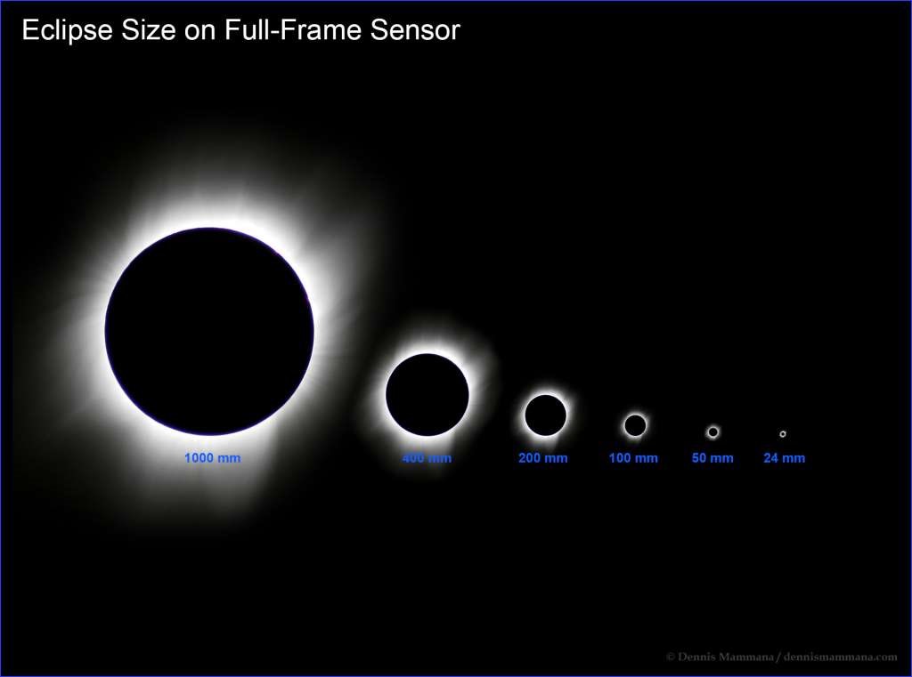 What the sun and the moon look like on a full frame camera with different zoom lenses.
