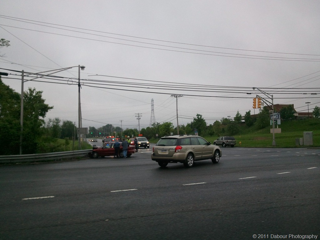 While running errands this morning I passed by a motor vehicle accident that just happened. The red car crashed into the barrier. Also involved and not seen in this photo was another blue car (off to the right and temporarily parked in the median). No one appeared to be hurt which is good news as always.