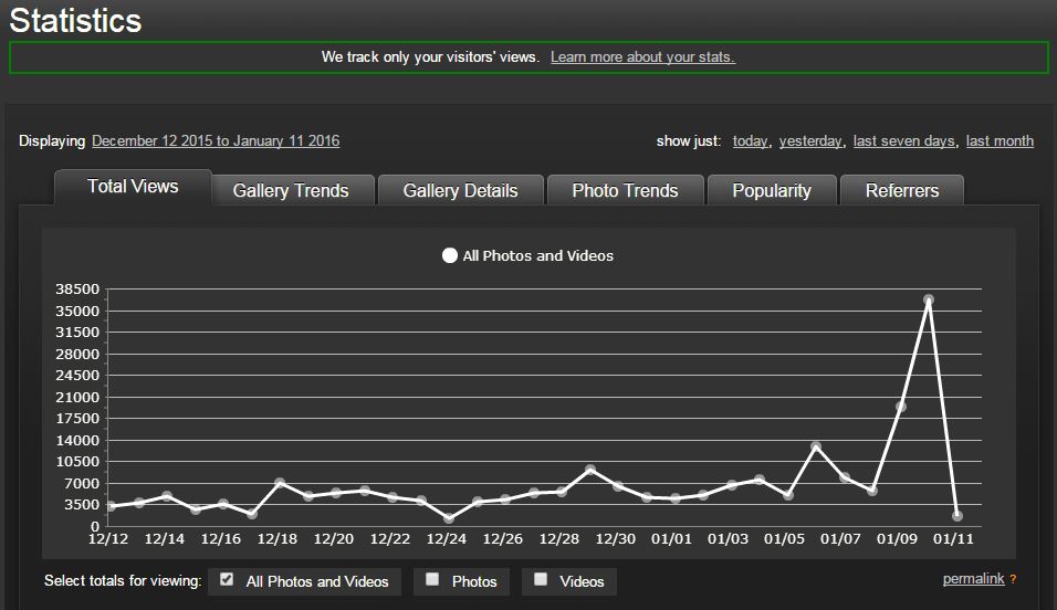 This is what happens when you post publicity shows from a large theater group and a wedding to your photography web site right around the same time! The sharp down at the end is only because it’s 8 am in the morning and the days stats are not finished yet.