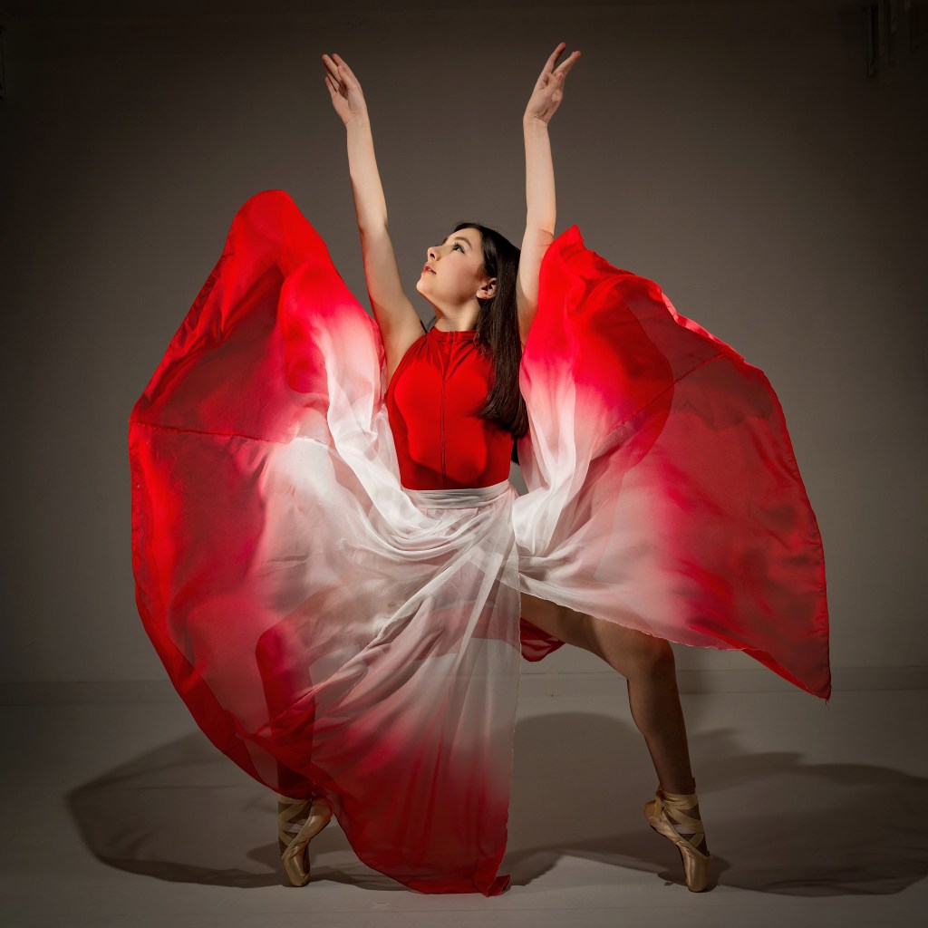 A female dancer in a white leotard and flowing red skirt performing an expressive, mid-motion pose against a professional gray studio backdrop.